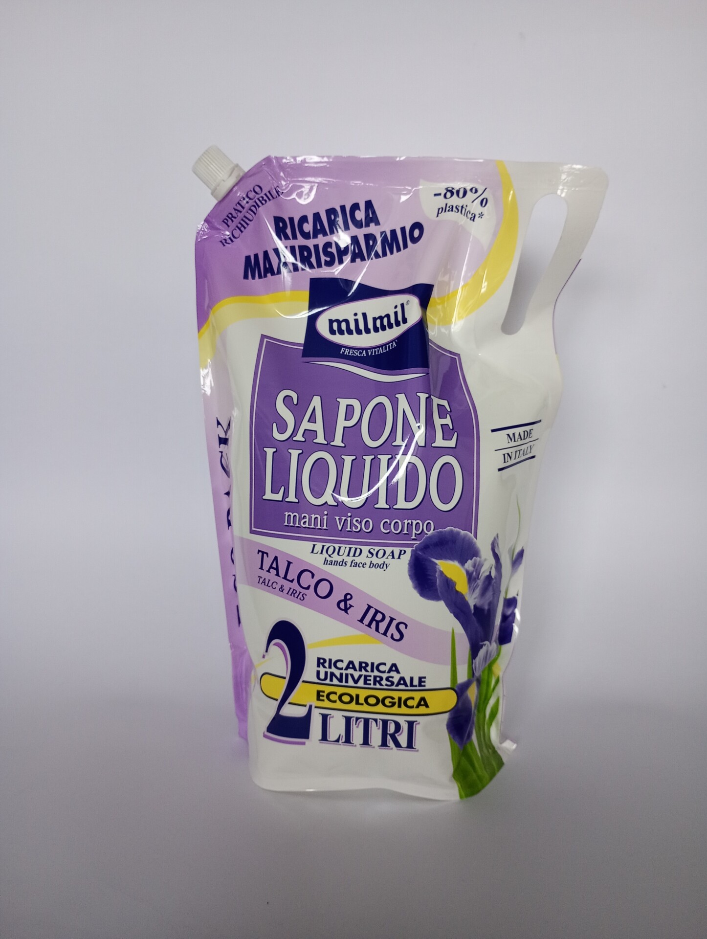 Milmil sapun lichid rezerva, 2 litri, pentru fata, corp si maini, cu aroma de talc si iris.