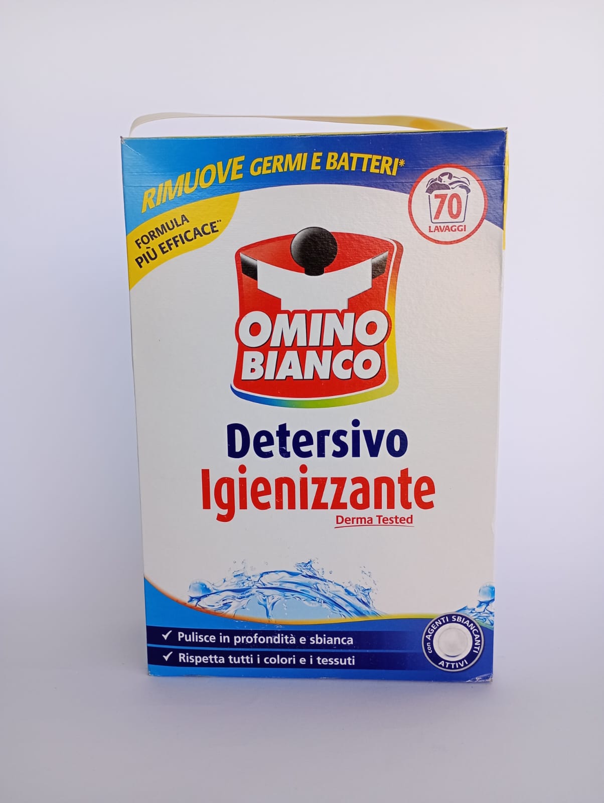 Omino Bianco detergent praf 70 spalari, 3,85 kg. Este un detergent dezinfectant, care curata in profunzime si respecta toate culorile. Ideal pentru haine albe.